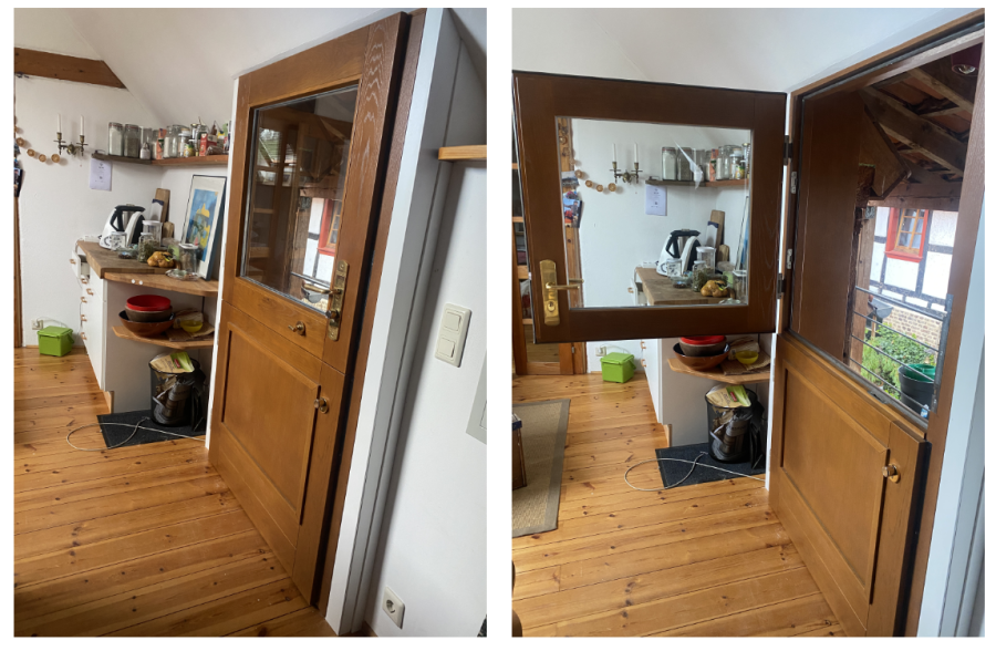 Auf einem Hof, auf dem auch heute noch viele Kleintiere unterwegs sind, liegt die Idee einer Klöntür nahe: Die Tür ist in zwei Hälften oben und unten geteilt. Der untere Teil kann zu bleiben, während der obere Teil geöffnet werden kann wie ein großes Fenster.