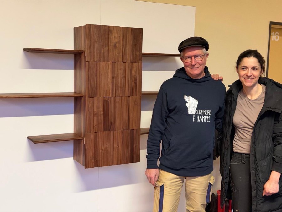 Mit dabei: Pia Bellebaum, die in unserer Werkstatt bereits ihre Ausbildung zur Gesellin erfolgreich absolviert hatte und nun die vierte Meisterin ist, die aus der Schreinerei Hampel hervorgeht. Auf dem Bild sind die vier zu sehen: v.l. Laurens Hübsch, Mario Koll, Pia Bellebaum, Nora Nallinger und Stefan Hampel